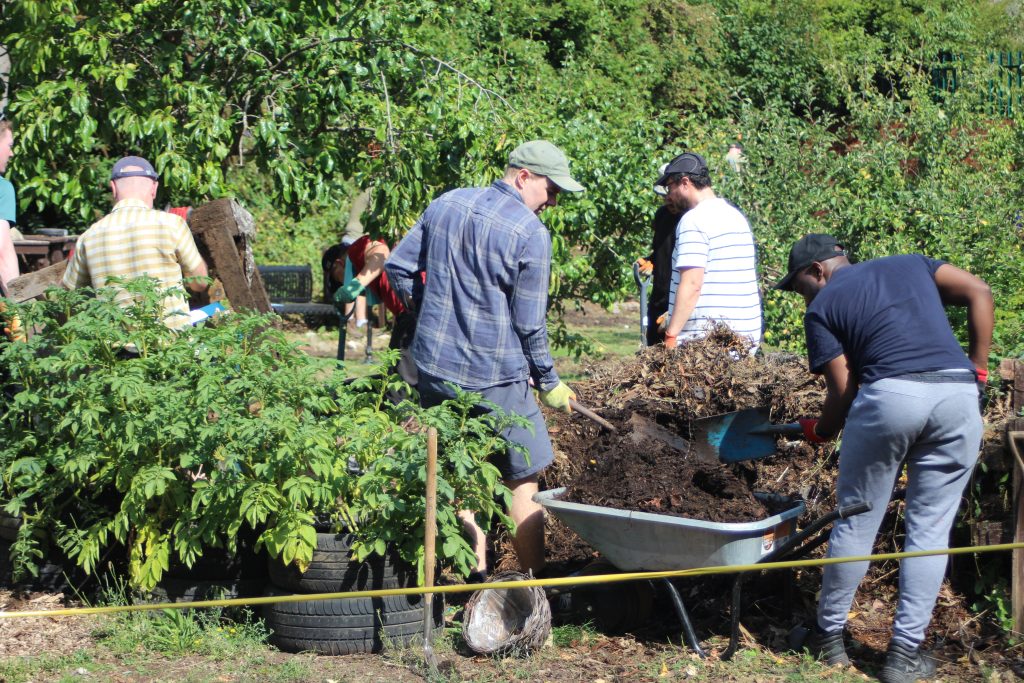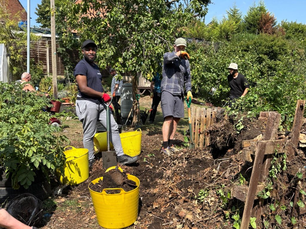 Volunteers from HS2 were on site to help to demolish the Community Orchards existing raised beds, relocate Compost Bins and repaint several metal benches.